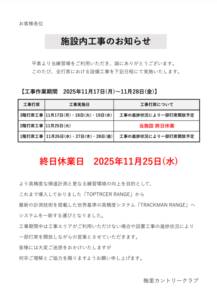 工事期間中は一部打席を開放しながら営業を継続いたします。