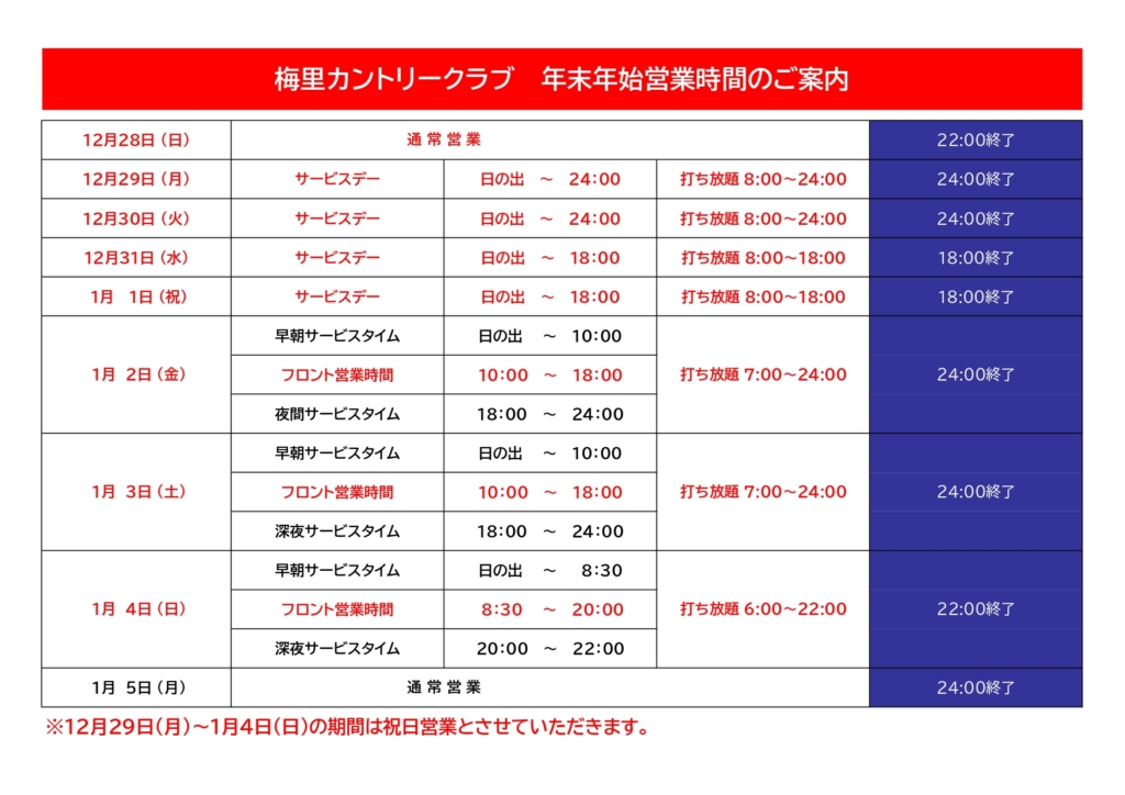 【梅里カントリークラブ 年末年始 営業スケジュール】