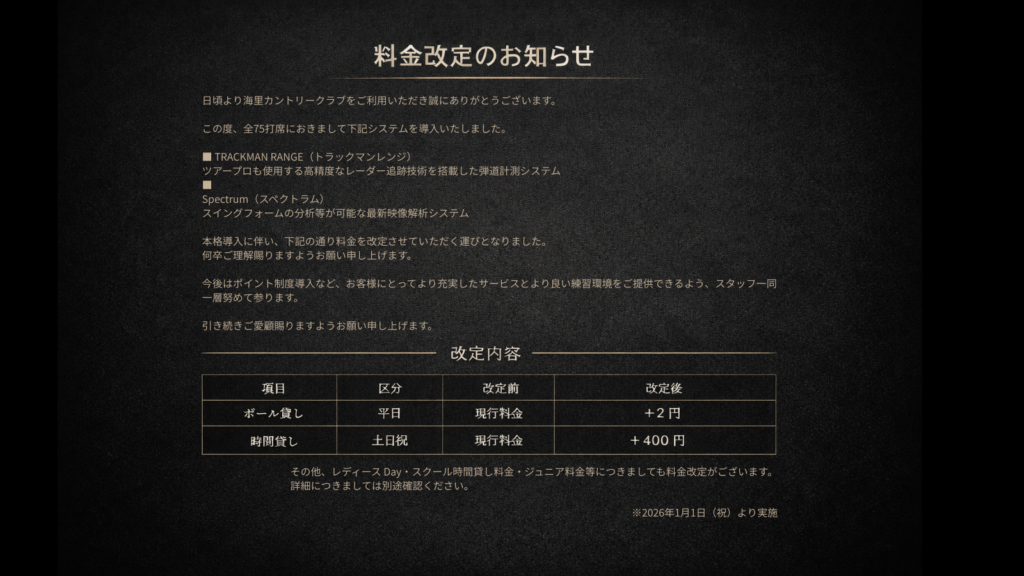 料金改定のお知らせ(2026年1月1日より)~より快適な練習環境のために~